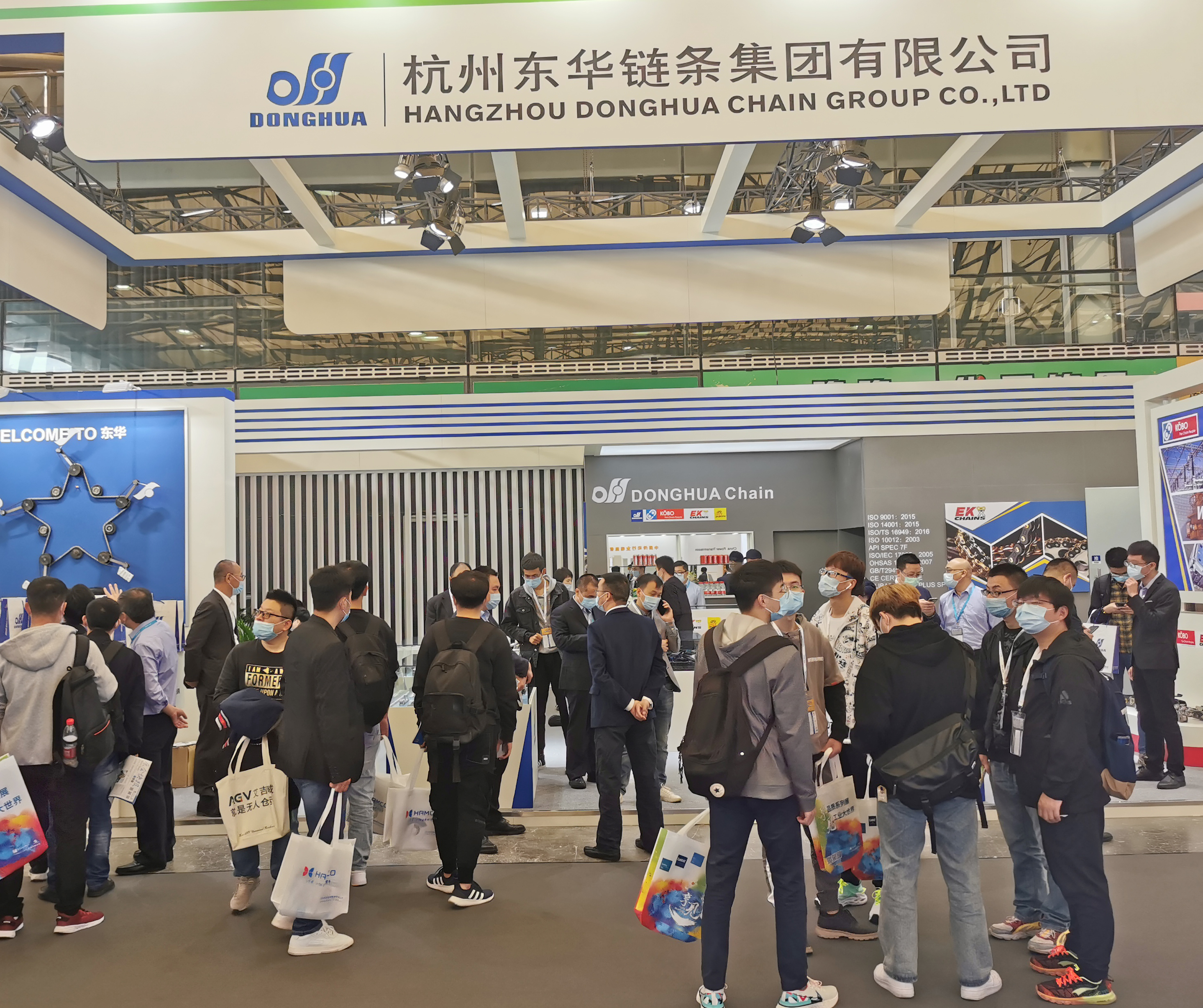 東華鏈條展廳設計新穎,大氣,展示了DONGHUA、自強、盾牌、KOBO、EK等國內外著名品牌。特別是展臺上一款由鏈條、鏈輪、企業LOGO組成的創意組合,不斷變幻造型,吸引了許多客戶和觀眾駐足拍照、拍視頻。