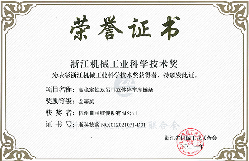 6月30日,浙江省機械工業(yè)聯(lián)合會召開會員大會。會上表彰2021年度浙江機械工業(yè)科學(xué)技術(shù)獎,全省機械領(lǐng)域共有72項科技創(chuàng)新項目獲獎。東華 “2.0T汽車發(fā)動機用靜音鏈條”和“高穩(wěn)定性雙吊耳立體停車庫鏈條”均獲三等獎,這是東華產(chǎn)品創(chuàng)新項目連續(xù)十年榮獲浙江機械工業(yè)科技獎,也是2021年度全省機械行業(yè)科技創(chuàng)新成果獎中唯一鏈傳動企業(yè)的高端產(chǎn)品獲獎。