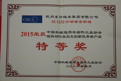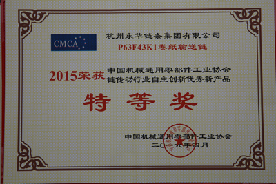 中國(guó)機(jī)械通用零部件工業(yè)協(xié)會(huì)鏈傳動(dòng)分會(huì)為鼓勵(lì)各鏈條制造企業(yè)加強(qiáng)自主創(chuàng)新,不斷研制新產(chǎn)品,每年評(píng)比表彰一批各企業(yè)自主創(chuàng)新的產(chǎn)品。東華集團(tuán)每年均有一批自主創(chuàng)新新產(chǎn)品問世,這些新產(chǎn)品不斷推動(dòng)了中國(guó)鏈傳動(dòng)行業(yè)持續(xù)發(fā)展壯大。東華集團(tuán)被中國(guó)機(jī)械通用零部件工業(yè)協(xié)會(huì)鏈傳動(dòng)分會(huì)授予2015中國(guó)機(jī)械通用零部件工業(yè)協(xié)會(huì)鏈傳動(dòng)行業(yè)自主創(chuàng)特等獎(jiǎng)的是SC1252分動(dòng)箱齒形鏈、P63F43K1卷紙輸送鏈、HV4TT汽車生產(chǎn)線用雙節(jié)距齒形鏈;被授予優(yōu)秀獎(jiǎng)的是C2062H ORSD帶密封圈農(nóng)機(jī)鏈和P47.25/55.75F1一次成型內(nèi)單節(jié)農(nóng)機(jī)鏈。