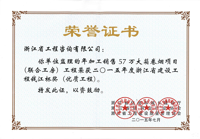 2015年度浙江省建設工程錢江杯獎(優(yōu)質(zhì)工程)-年加工銷售57萬大箱卷煙項目(聯(lián)合工房)