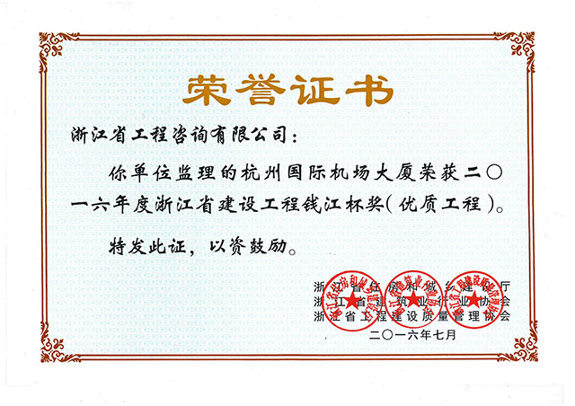 2016年度浙江省建設工程錢江杯獎(優(yōu)質(zhì)工程)-國際機場大廈
