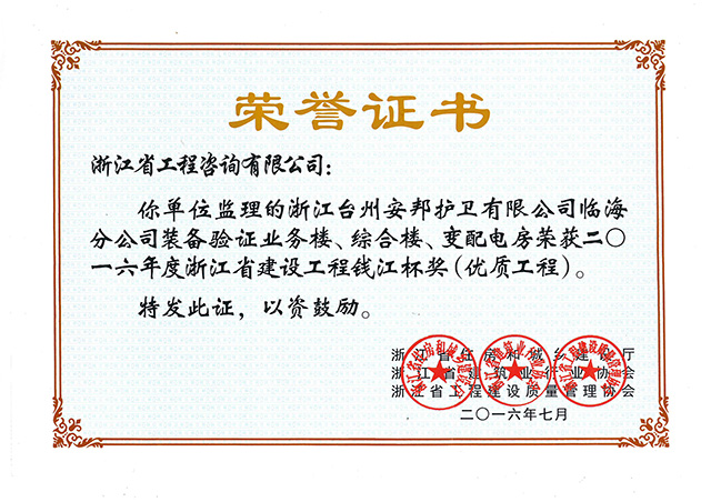 2016年度浙江省建設工程錢江杯獎(優(yōu)質(zhì)工程)-浙江臺州安邦護衛(wèi)有限公司臨海分公司裝備驗證業(yè)務樓、綜合樓、變配電房
