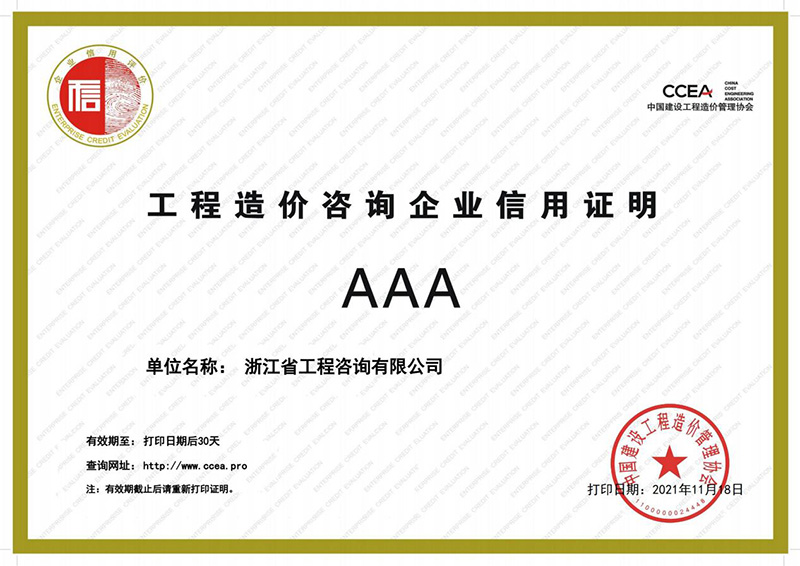 近日,根據《中國建設工程造價管理協會關于印發<工程造價咨詢企業信用評價管理辦法>的通知》等有關規定,中國建設工程造價管理協會組織開展了2021年第三批工程造價咨詢企業信用評價工作。經企業申報、各省級工程造價行業協會(中價協專業工作委員會)初評,中價協組織專家終評等程序,對374家工程造價咨詢企業信用評價等級結果予以公布。公司取得工程造價咨詢企業信用評價等級AAA。