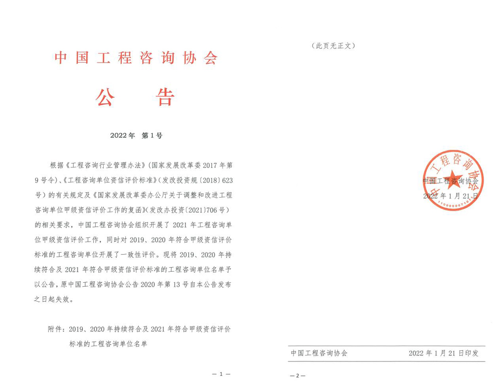 近日,根據《工程咨詢行業管理辦法》(國家發展改革委2017年第9號令)、《工程咨詢單位資信評價標準》(發改投資規[2018]623號)的有關規定及《國家發展改革委辦公廳關于調整和改進工程咨詢單位甲級資信評價工作的復函》(發改辦投資[2021]706號)的相關要求,中國工程咨詢協會組織開展了2021年工程咨詢單位甲級資信評價工作,同時對2019、2020年符合甲級資信評價標準的工程咨詢單位開展了一致性評價。我公司順利獲得建筑和市政公用工程專業工程咨詢單位甲級資信延續。