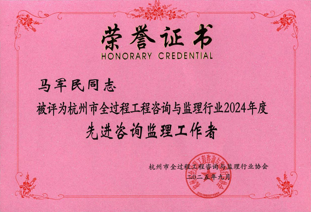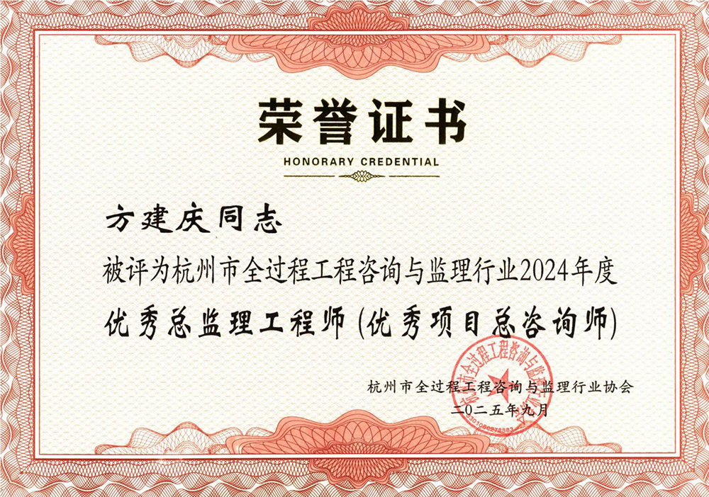 另外,我公司方建慶同志被評為杭州市全過程工程咨詢與監理行業2024年度優秀總監理工程師(優秀項目總咨詢師),馬軍民同志被評為杭州市全過程工程咨詢與監理行業2024年度先進咨詢監理工作者。