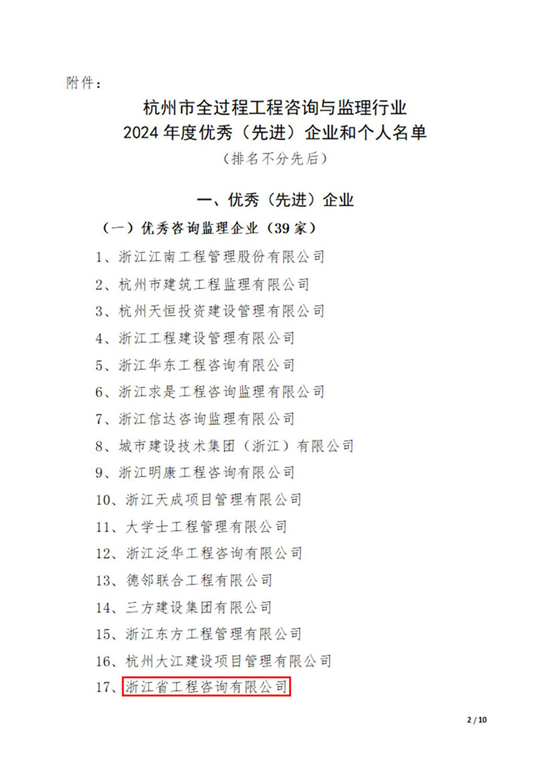 近日,根據杭州市全過程工程咨詢與監理行業協會六屆五次理事會決議精神和杭咨監協(2025)6號文件,杭州市全過程工程咨詢與監理行業協會組織開展了杭州市咨詢監理行業2024年度優秀(先進)集體和個人選樹活動。經協會秘書處初審,選樹活動評審委員會評審,我公司被評為杭州市全過程工程咨詢與監理行業2024年度優秀咨詢監理企業。