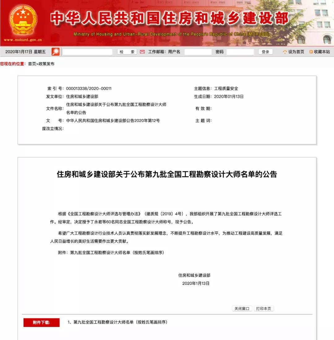 2020年1月,住房和城鄉(xiāng)建設部公布第九批全國工程勘察設計大師名單,共有60位同志被授予全國工程勘察設計大師稱號,其中建筑設計專業(yè)7位。中衡設計集團股份有限公司董事長、首席總建筑師馮正功榮獲全國工程勘察設計大師稱號。