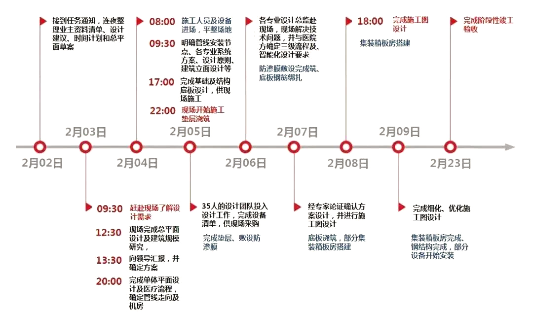 2月4日9:30,各專(zhuān)業(yè)方案溝通會(huì)議,明確管線安裝節(jié)點(diǎn)、各專(zhuān)業(yè)系統(tǒng)方案、設(shè)計(jì)原則、建筑立面設(shè)計(jì)等,全面展開(kāi)設(shè)計(jì)工作;同時(shí)聯(lián)系集裝箱式板房廠家等專(zhuān)項(xiàng)顧問(wèn)公司,協(xié)調(diào)同步開(kāi)展設(shè)計(jì)工作;17:00完成基礎(chǔ)及結(jié)構(gòu)底板設(shè)計(jì),供現(xiàn)場(chǎng)施工;22:00,現(xiàn)場(chǎng)開(kāi)始施工,墊層澆筑。2月5日,設(shè)計(jì)團(tuán)隊(duì)35人投入緊張的設(shè)計(jì)工作,完成設(shè)備清單,供現(xiàn)場(chǎng)采購(gòu)。從2月3日至4日,約36小時(shí)便保證了現(xiàn)場(chǎng)順利開(kāi)工。