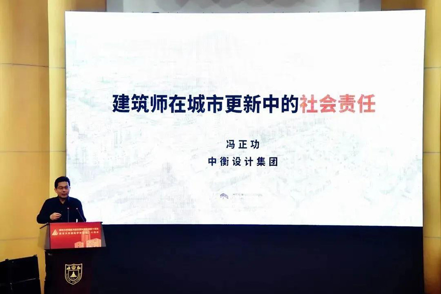 全國工程勘察設計大師、中衡設計集團董事長/首席總建筑師、南京大學兼職教授馮正功受邀參加了慶典,并在南京大學建筑學專業重建20周年慶典活動的重要內容——建筑大師學術報告會上作了《建筑師在城市更新中的社會責任》的學術報告。