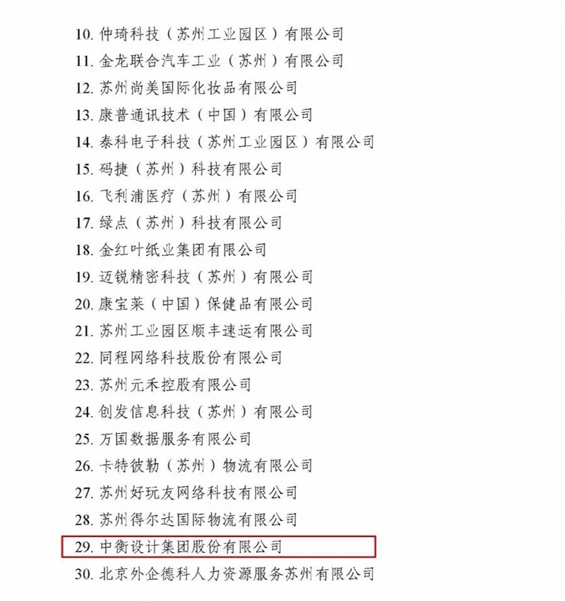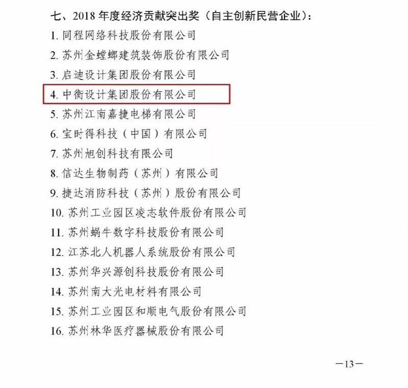 其中“2018年度經濟貢獻突出獎(營收增長)”大獎,以表彰中衡設計2018年營收快速增長對園區GDP增長做出的貢獻,中衡設計也是唯一上榜的工程技術服務企業。同時獲得此殊榮的還有蘇州三星顯示公司、博世汽車部件(蘇州)有限公司、三星電子(蘇州)半導體有限公司、康普通訊技術(中國)有限公司、飛利浦醫療(蘇州)有限公司、康寶萊(中國)保健品有限公司、卡特彼勒(蘇州)物流有限公司等國際著名公司。